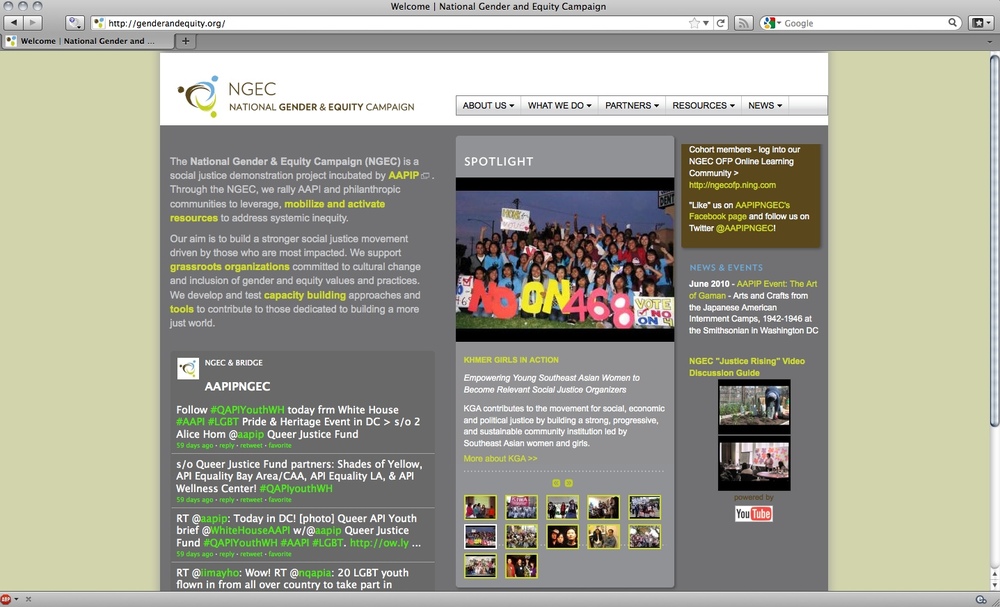 http://www.genderandequity.org was created for The National Gender & Equity Campaign. The NGEC was a 3-year pilot program incubated by AAPIP whose aim was to build a stronger social justice movement through capacity building. NGEC supported organizations committed to cultural change and inclusion of gender equity values and practices. The site was a way to publicizeContinueContinue reading “genderandequity.org – NGEC”