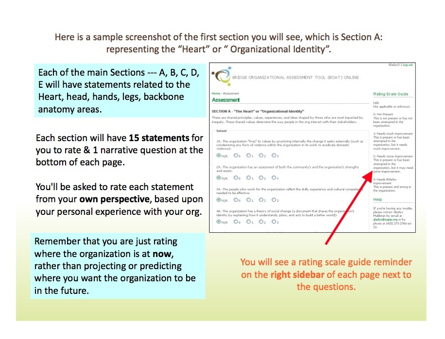 Previous Image Next Image FEATURED PROJECT -> BRIDGE Organizational Assessment Tool A screen capture of the types of questions in the online tool