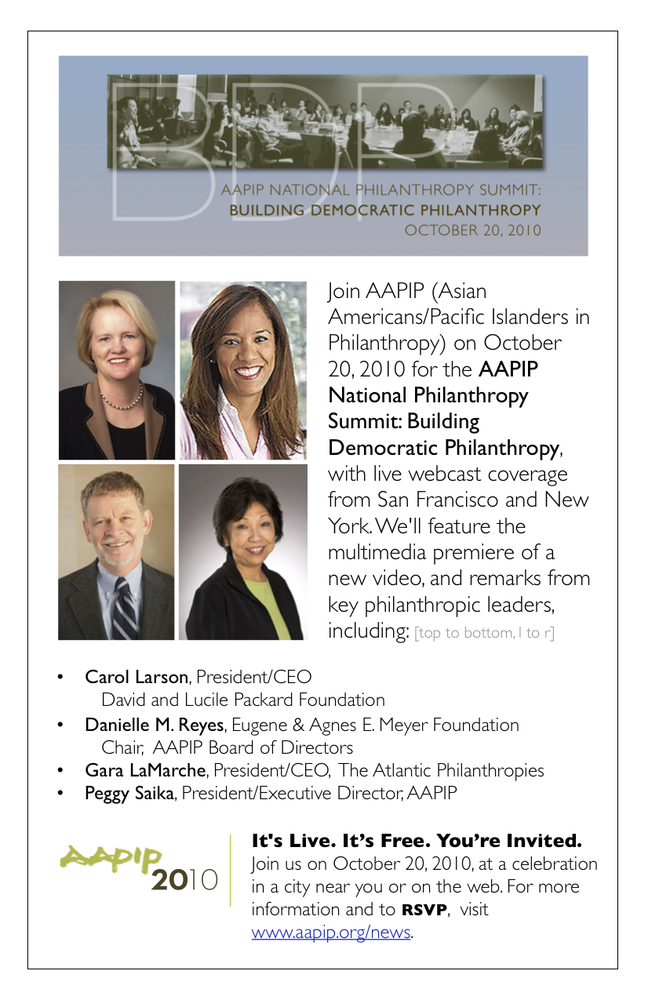 We created a “virtual summit” in lieu of a traditional conference to celebrate AAPIP’s 20th Anniversary. In October 2010, AAPIP’s chapters organized “viewing parties” in 10 cities (NY, SF, LA, Houston, Philadelphia, DC, Silicon Valley, Boston, Chicago and Seattle) to watch a livestream of AAPIP speakers and celebrations broadcast online from our headquarters in SF and Atlantic Philanthropies in NYC.
